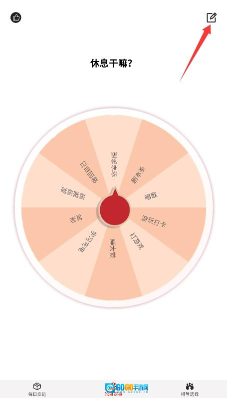 2、进入轮盘定事界面后,点击右上角的编写图标,即可进入转盘内容的自定义编辑模式。