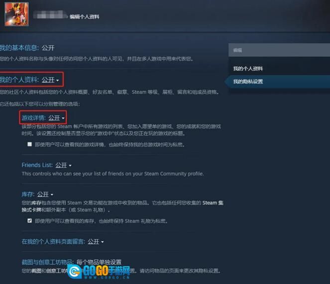 1. 打开Steam客户端,依次进入个人资料页面、编辑个人资料界面,找到“我的隐私设定”选项;按照图示要求,将“我的个人资料”与“游戏详情”这两项设置为公开状态(特别注意:游戏时长对应的勾选框请勿勾选)。