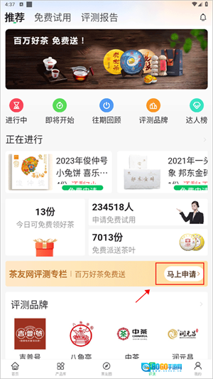 1、进到茶友网后,在评测界面点击“马上申请”
