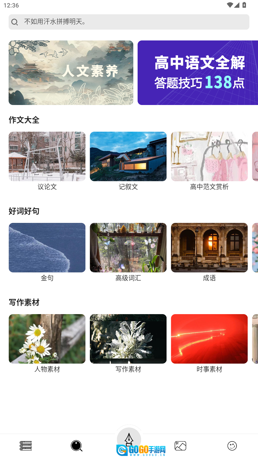 2、第二个界面是发现,可以在这里搜索或者点击自己想看的内容,包括文章,答题技巧,写作素材和好词好句等等。