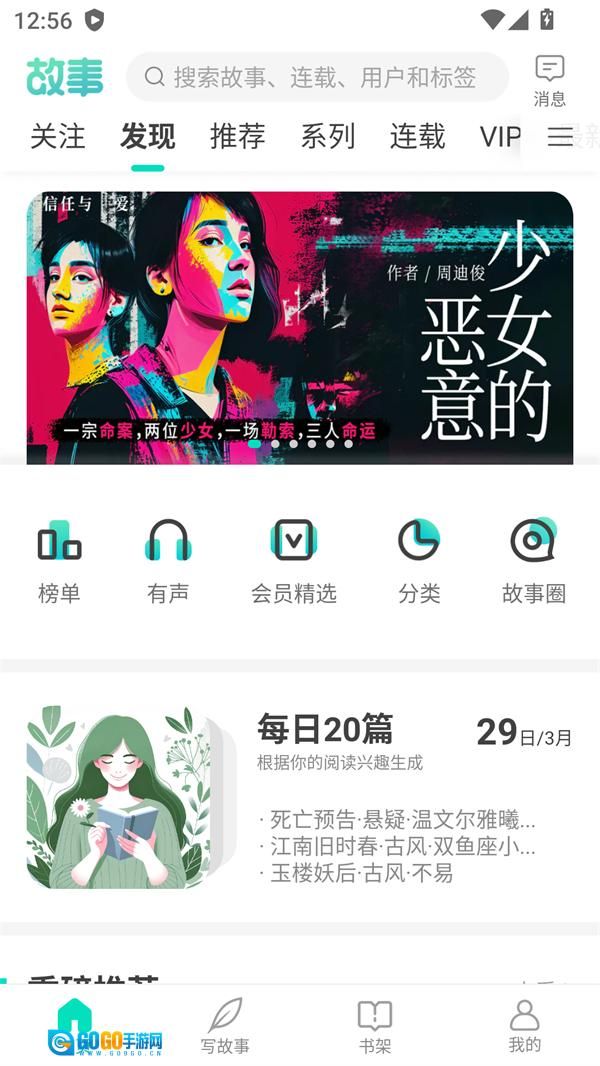 每天读点故事是一款原创故事阅读应用,平台上汇聚了众多签约作者创作的大量优质短篇与连载作品,内容覆盖悬疑、情感等多种类型,风格丰富多元,情节环环相扣,既适合那些喜欢在碎片时间里沉浸于故事世界的读者,也能让用户化身为讲述者,分享属于自己的故事。