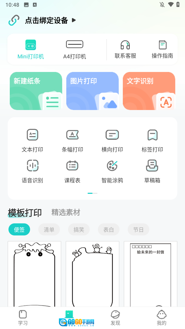 咕咕机是一款配合迷你便携打印机使用,将数字内容快速转化为纸质输出,如聊天记录、语音留言、学习资料等,融入了社交元素,比如“传纸条”和“语音纸条”,让沟通变得更有趣味,多种模板和素材,涵盖学习、办公等多个场景,帮助人们用纸张记录生活的点滴。