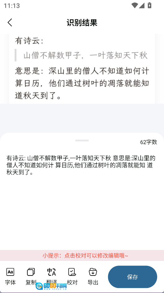 3、识别出的文字可与原图进行对照,同时支持复制、翻译、导出等便捷操作