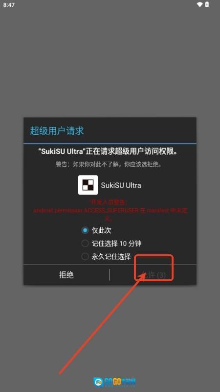1、打开已安装的SukiSUUltra,授予软件相应权限;