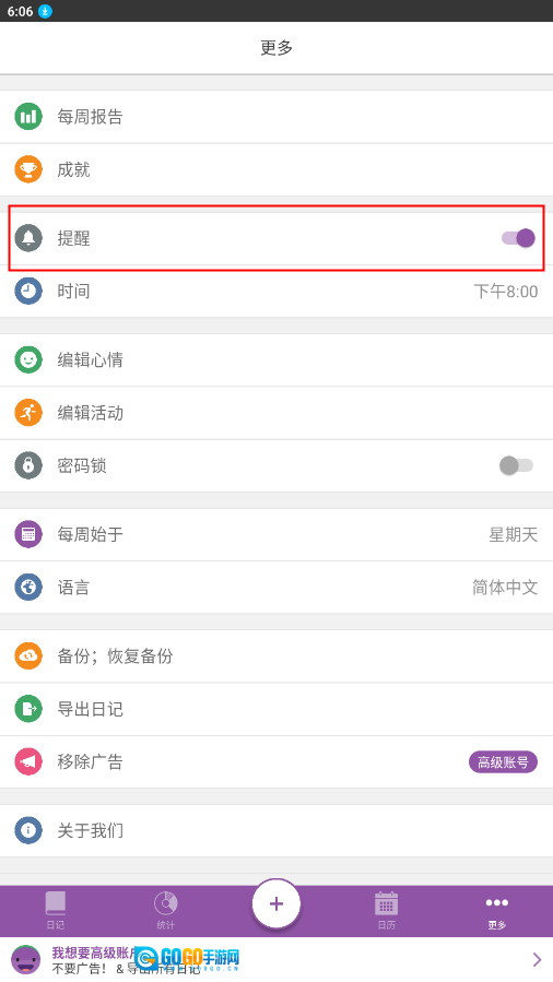 7、最后进入“更多”设置页面,开启“提醒”功能,避免忘记记录日记。
