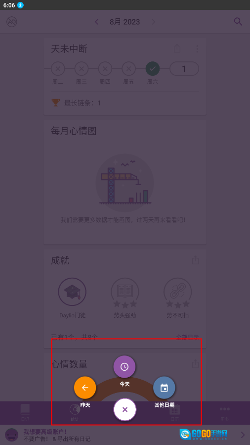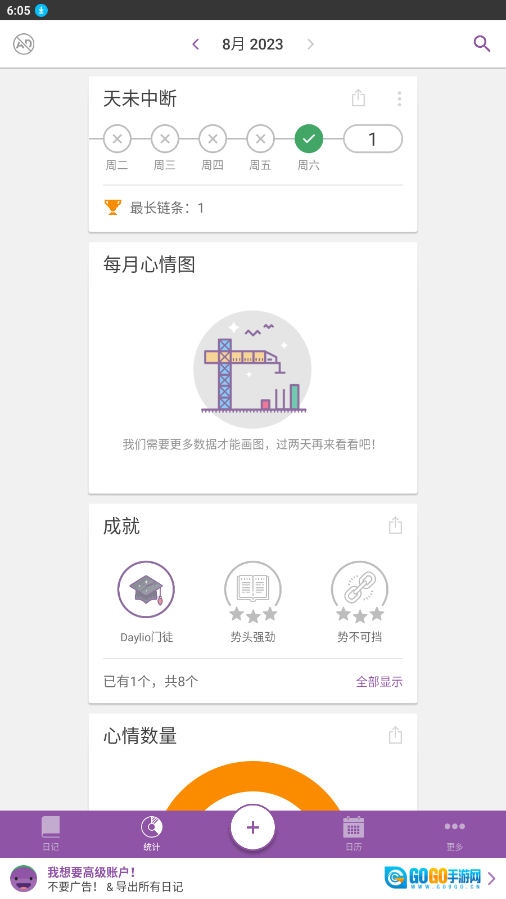 4、进入“统计”页面后,能查看“每月心情图”“成就”“心情数量”等相关数据。