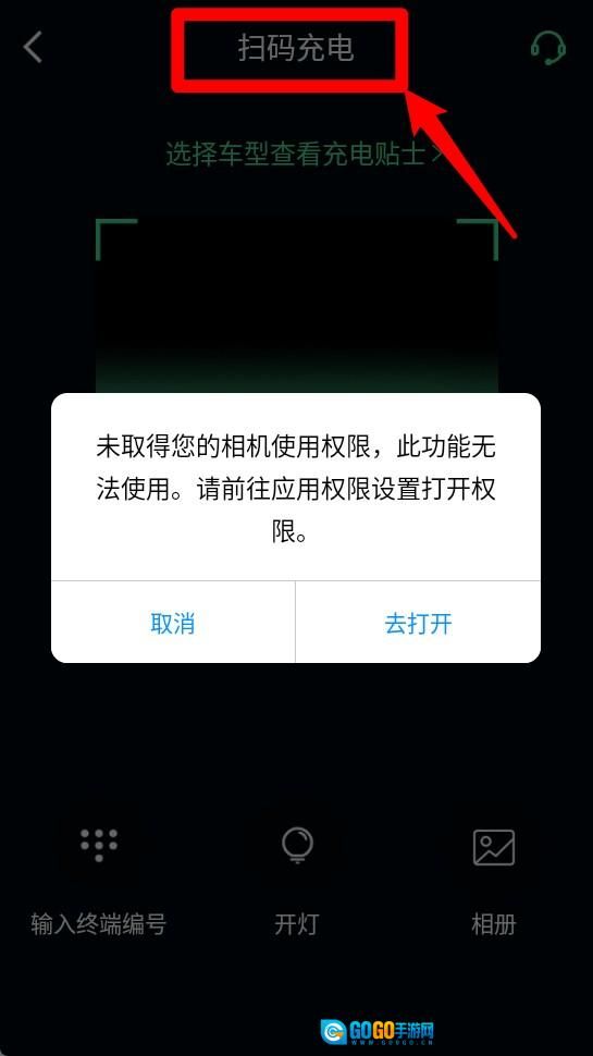 4、点击扫码充电功能时,系统会请求获取相机权限,授权允许后,您就可以扫描充电桩上的二维码,进而启动充电流程。