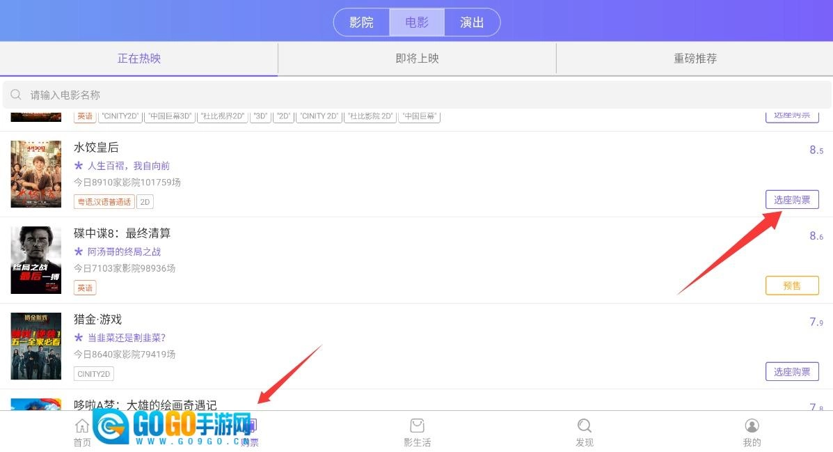 3、切换至购票界面,挑选心仪影片后轻触选座购票按钮,完成在线选座与支付操作。