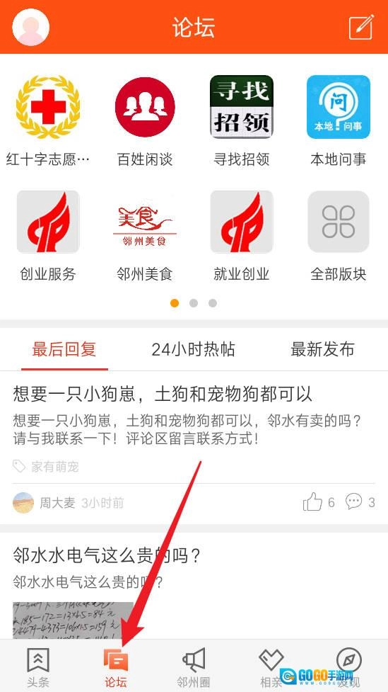 2、点击“论坛”板块,即可浏览百姓话题、招聘信息、美食推荐等互动社区类内容。