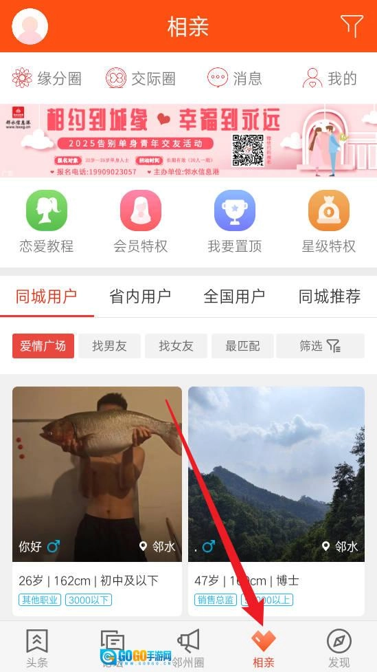 4、点击相亲板块,查看本地单身用户的资料,可按地区或条件进行精准筛选。