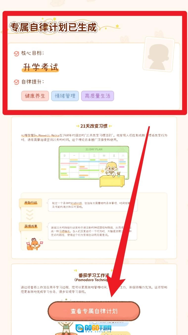 3. 页面更新完成后,您就能查看完整的专属自律计划内容了,其中包含核心目标以及三项重点方向。