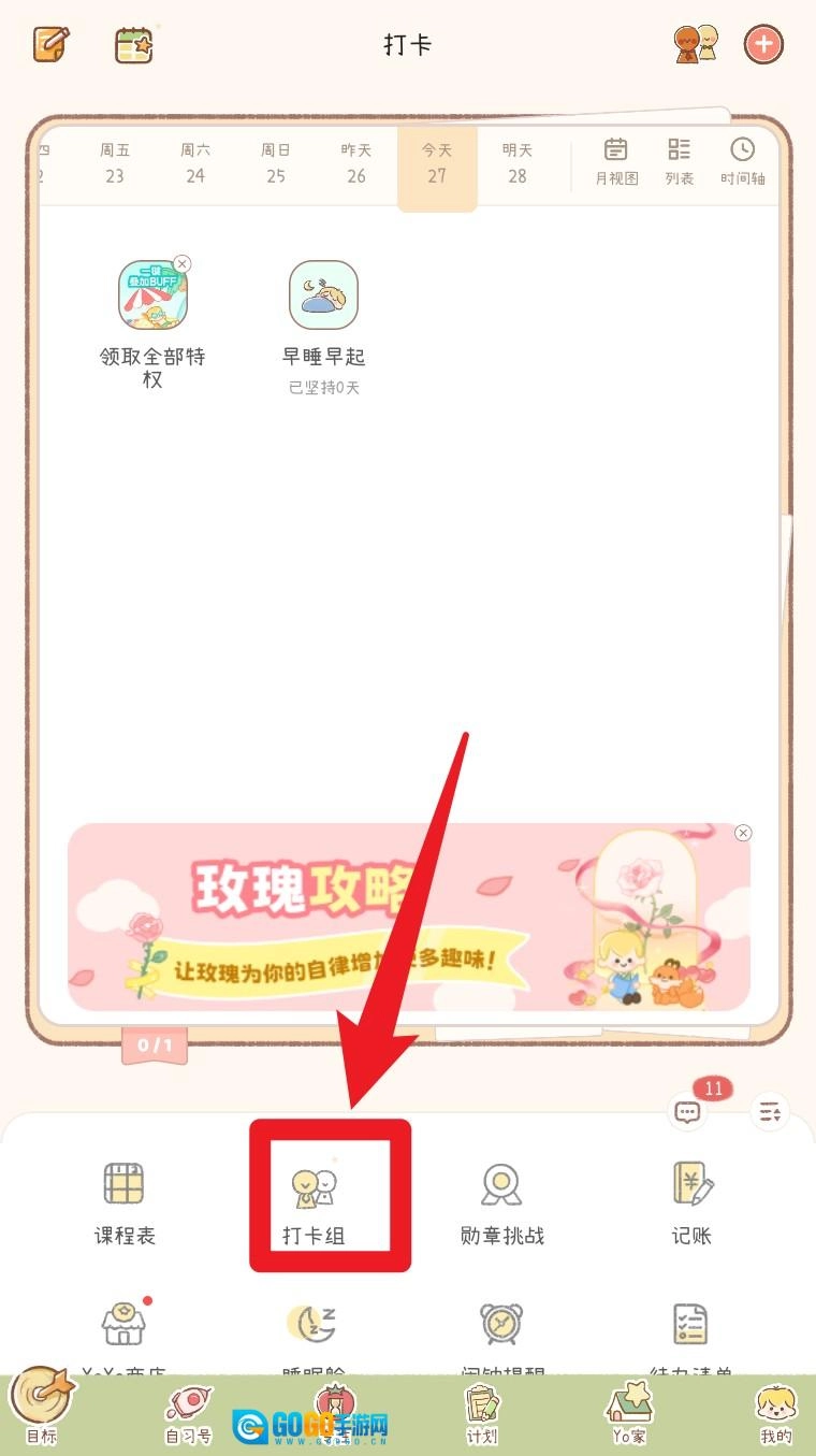 4. 回到首页后,点击底部菜单栏里的打卡组,进入小组活动板块,为加入任务挑战做准备。