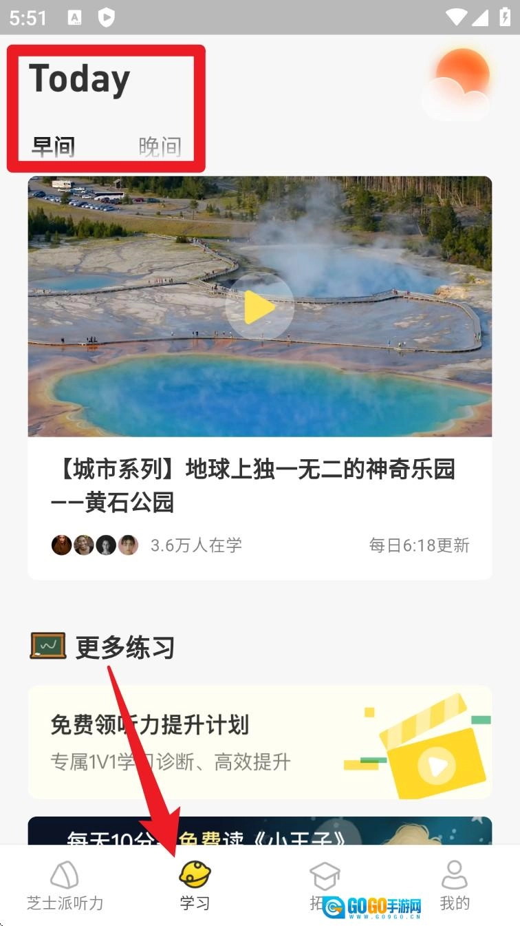 3. 点击底部导航栏的“学习”选项,进入每日听力任务区域,这里支持晨间、晚间不同主题的切换观看。