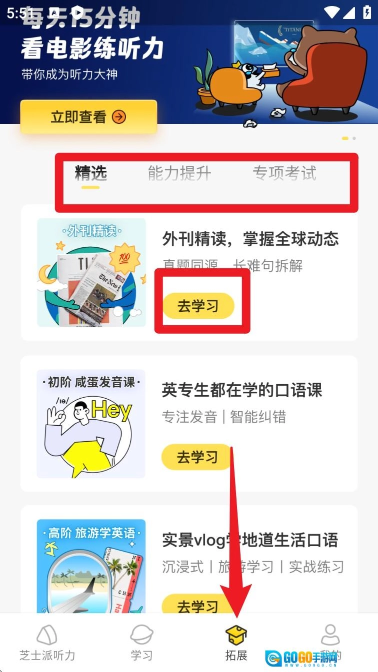 4. 在拓展版块里,能够进入外刊精读、发音训练、场景英语等功能区域,支持依据模块进行学习。