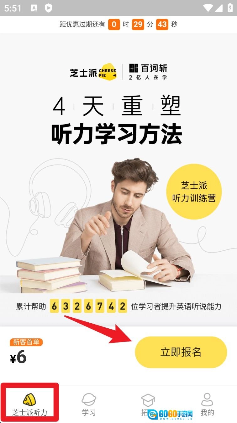 2. 登录后会自动跳转至主页,点击底部的芝士派听力板块,即可浏览课程详情与活动资讯,并且能一键完成报名操作。