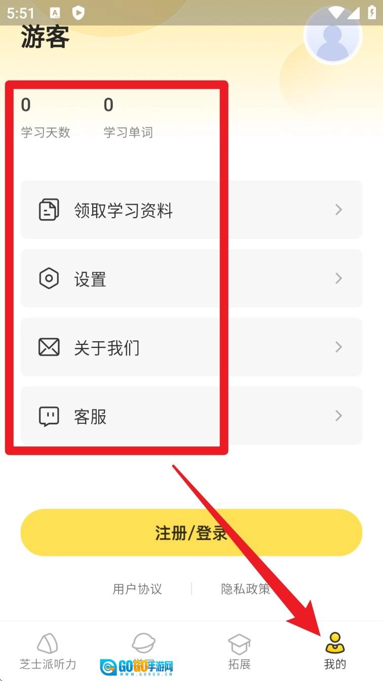5. 进入我的页面,可查看学习记录、领取资料、联系客服等,账号注册也能在此完成。