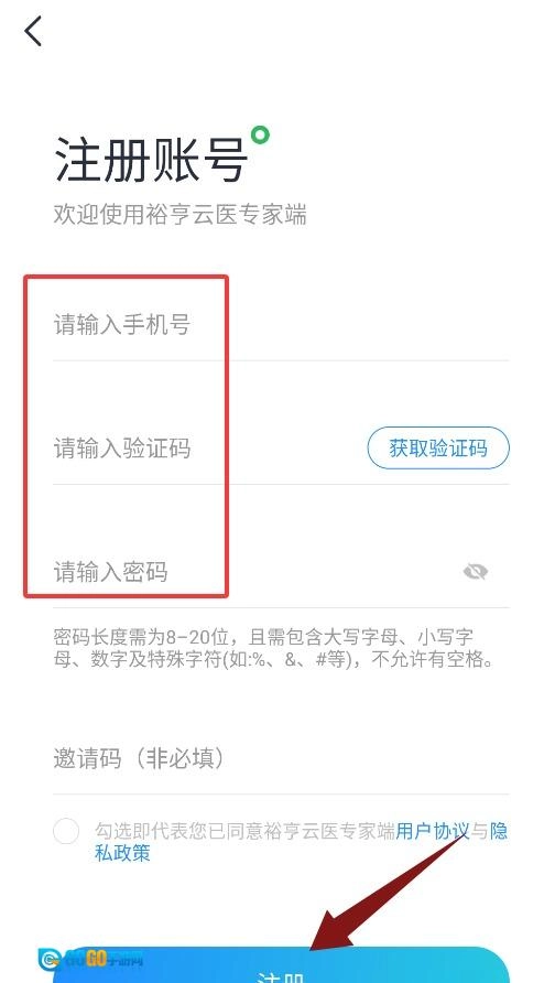 3、注册账号时输入手机号、验证码及密码,点击注册即可完成。