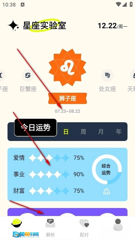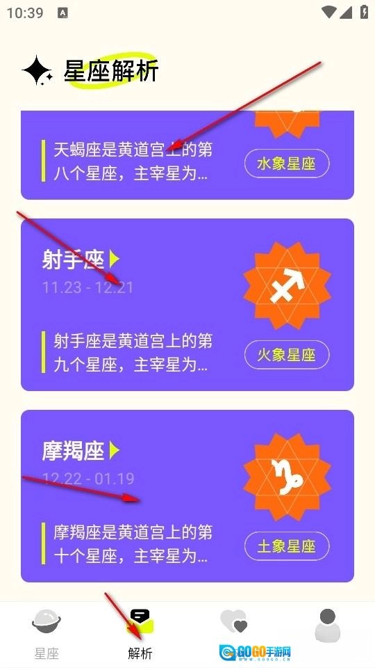 我们能够在首页的下方找到解析,点击进入解析界面能够查看到每一个星座的解析信息。