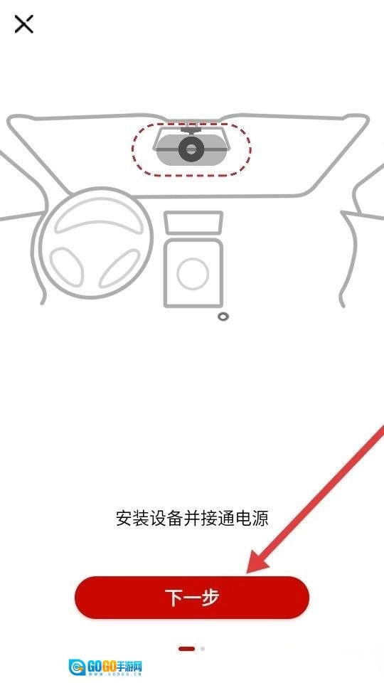 2、设备安装指引页面采用图示形式标注设备的安装位置,同时提示用户进行安装并接通电源;页面底部的红色“下一步”按钮设计醒目突出,能够辅助用户依照步骤完成设备的初始化设置流程。
