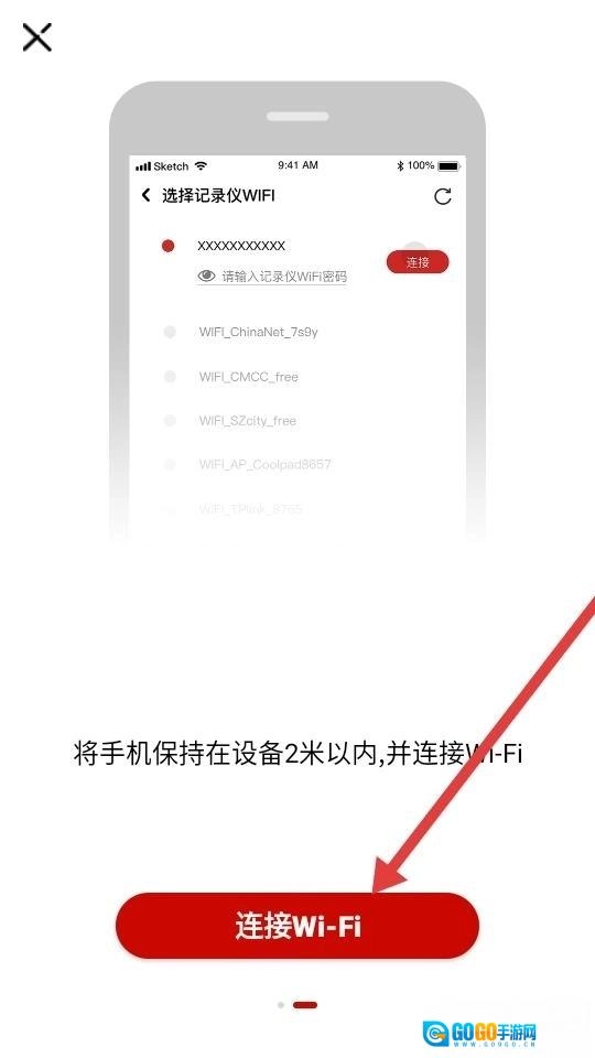 3、WiFi连接页面会提示用户将手机保持在设备2米范围内,同时展示WiFi列表界面,页面底部设有醒目的红色“连接WiFi”按钮,以此引导用户顺利完成设备的网络连接步骤。