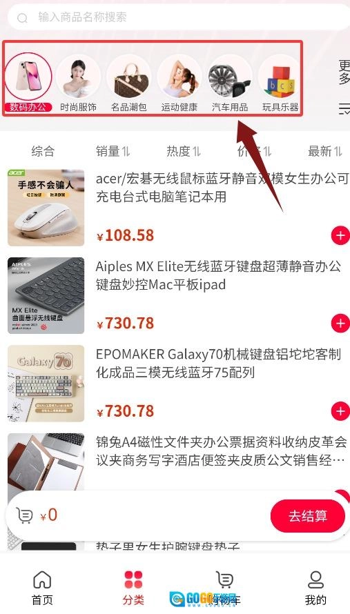 3、分类界面包含数码办公、时尚服饰、名品潮包、运动健康等类别。