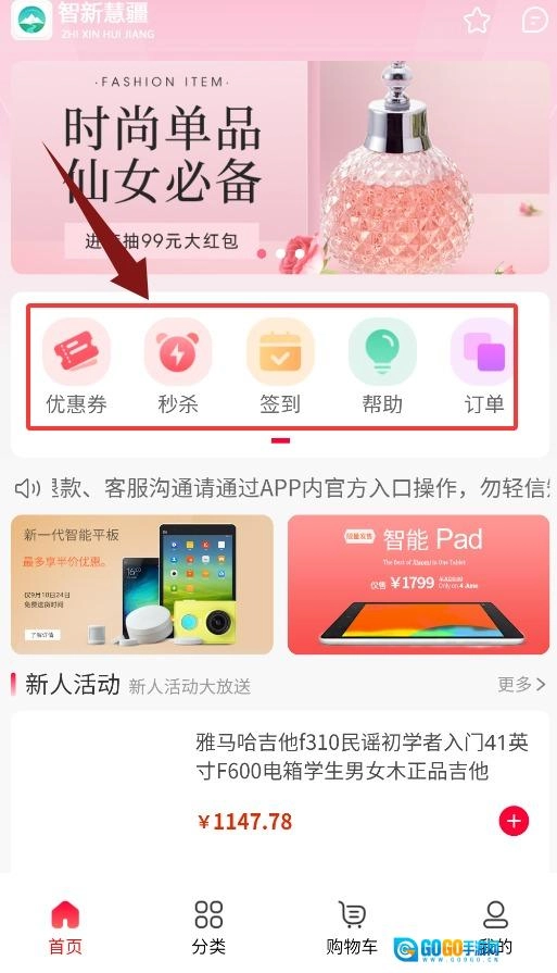 首页设有优惠券、秒杀专区、每日签到以及订单帮助的入口。