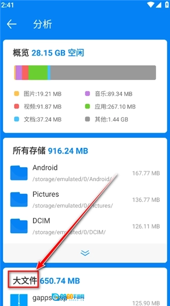 3、接下来会弹出一个窗口,我们点击“分析解开”来查看当前占用手机存储空间最大的文件夹以及所有大文件,这样便于用户对无用的大文件进行管理和删除操作(建议在删除前点击查看该文件是否为需要保留的文件)