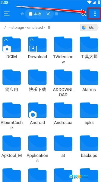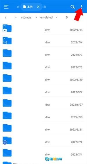 2、点击后进入下方界面,能看到手机里所有的文件夹(此处已对文件夹名称做了涂抹处理),若要对这些文件夹进行存储空间分析,可点击右上角的三个竖排点按钮。