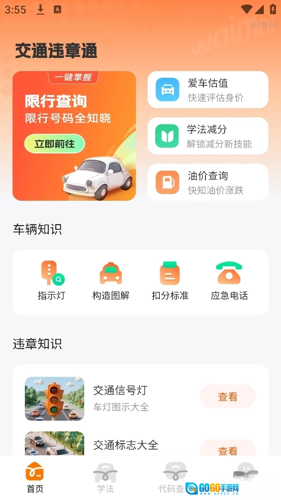 《交通汽车违章通》是一款专为车主设计的全能型交通服务,集成限行查询、违章处理、学法减分、油价监控等核心功能,覆盖车辆管理、出行规划、交规学习全场景。首页聚合实用工具,学法页提供分类习题库,违章页支持代码速查,油价页精准定位城市数据,助力车主高效解决出行难题。