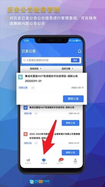 3、已发布公告页面支持按时间或项目进行查询,同时提供在线申请删除问题公告的功能,便于集中管理。