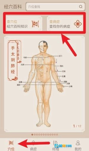 2、进入首页后,点击“查穴位”按钮可查看人体经络穴位图及相关知识科普内容。