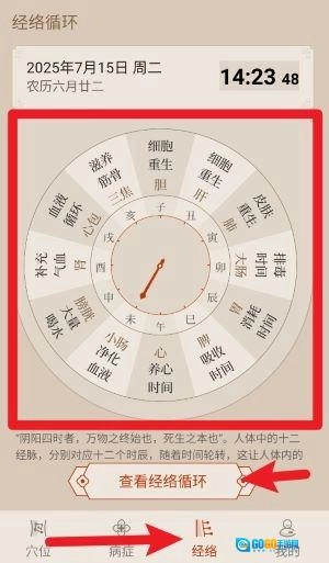 4、点击“经络”页面中的圆盘可查看人体十二经脉在一天内的气血运行时间段和调养建议。