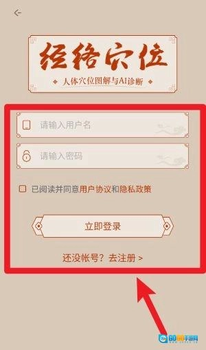 1、打开,首次使用需点击“去注册”按钮,输入用户名和密码完成账户注册流程。