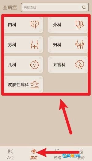 3、切换到“病症”栏目可根据分类快速查找各类内科、妇科、儿科等常见病症对应的穴位信息。