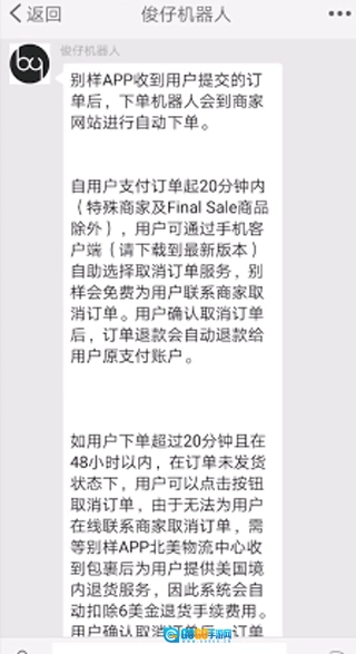 别样在收到用户提交的订单后,由下单机器人前往商家网站完成自动下单流程。自用户完成订单支付起算的20分钟内(特殊商家、标注不退不换/无法取消的商品、商家直邮类订单除外),用户可通过手机客户端(需确保为最新版本)自主发起取消订单服务,别样将免费协助联系商家办理取消。用户确认取消后,退款会自动原路退回至原支付账户。