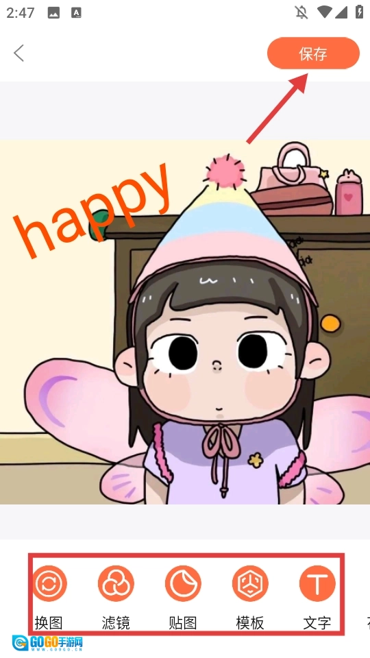 可以利用【换图】【滤镜】【贴图】【模板】【文字】这些功能来开展创作,创作完成后点击右上角的【保存】按钮,就能顺利完成DIY头像的制作啦。