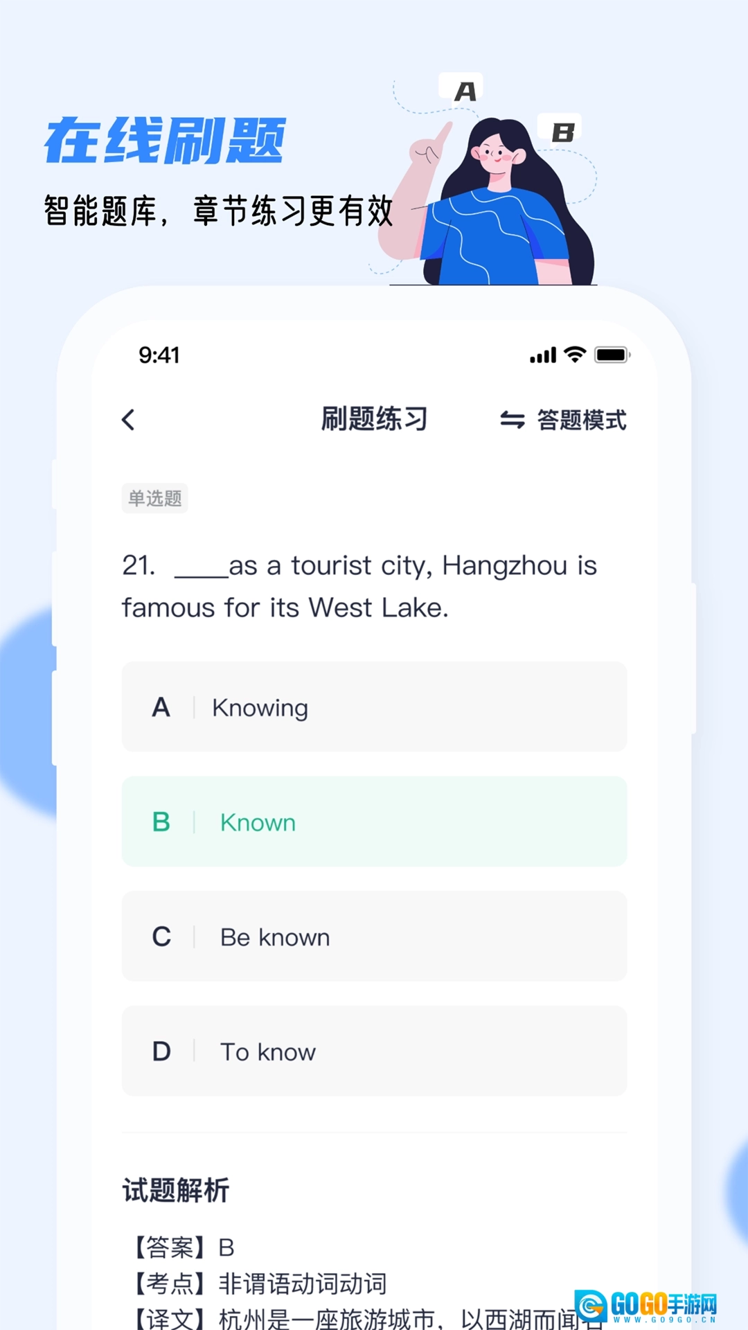 英语AB级小牛题库收录了海量的英语AB级考试相关题库与真题试卷,其中包含历年考试真题、仿真模拟试题以及针对各专项考点的练习内容。该软件借助智能刷题模式、详尽的答案解析以及题干全文翻译等实用功能,助力考生更透彻地掌握知识点,进而提升答题的速度与准确率。不仅如此,软件还配备了个性化的单词记忆工具、语法纠错系统,并且能够为考生制定定制化的学习计划,以此满足不同考生多样化的学习需求。