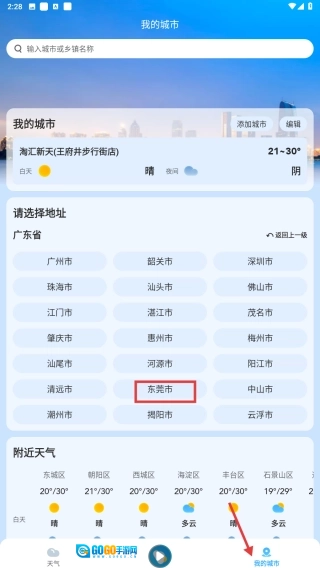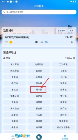 点击底部的“我的城市”选项,进入对应的页面后,在搜索框里输入具体的城市或乡镇名称,就能查找出你想了解天气情况的区域了。