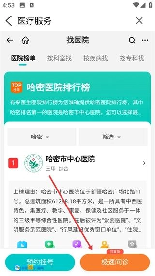 在找医院页面点击【极速问诊】按钮,就能开展快速问诊操作。