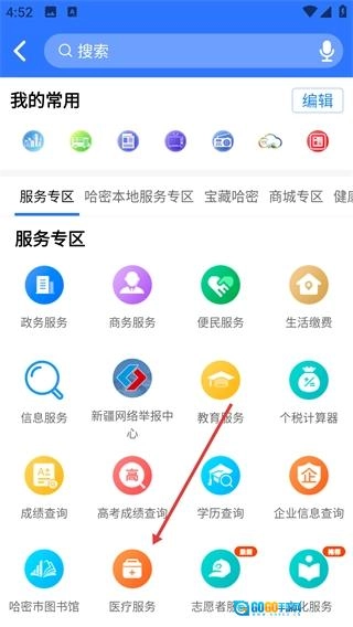 在服务列表页面的服务专区里,点击【医疗服务】这个选项,就能进入到医疗服务页面。
