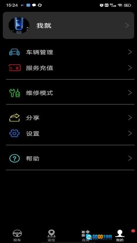 具备多样的个人主页管理功能,涵盖车辆管理、服务充值、维护模式以及共享等内容。