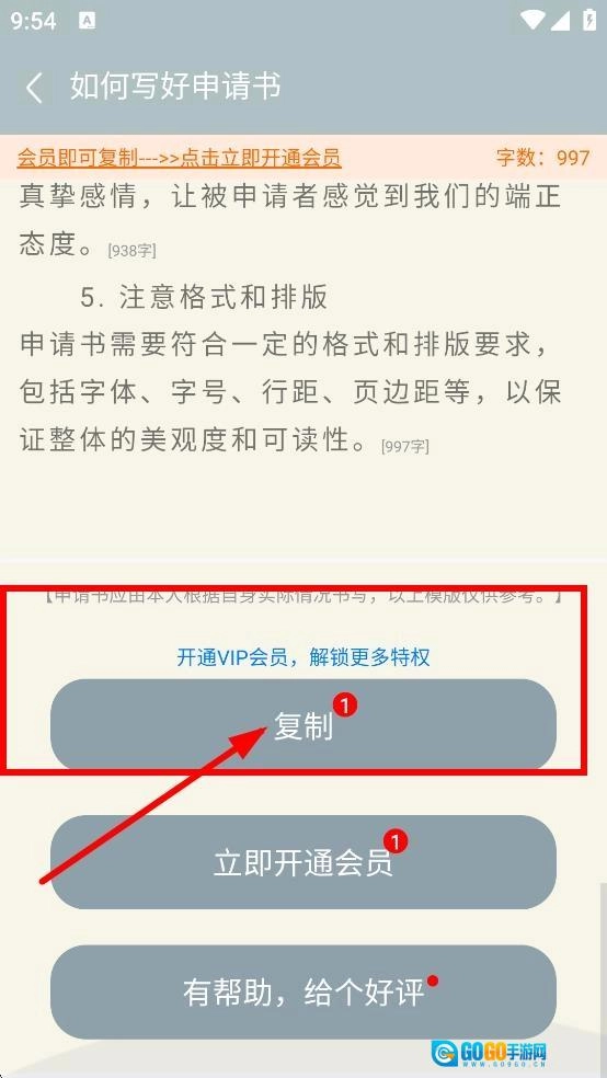 在“如何写好申请书”页面的底部,若您已开通VIP会员,可点击复制按钮来复制相关内容;您也可以选择立即开通会员,或是给该页面好评。