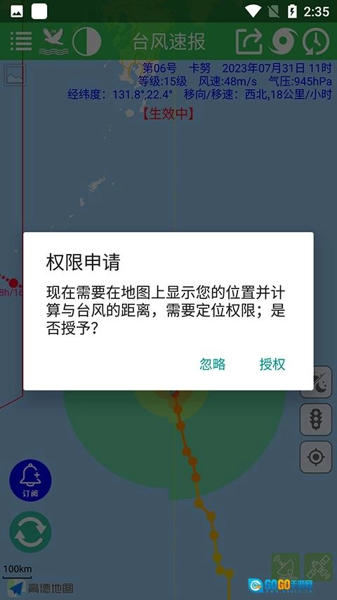当我们需要查看台风的风力情况时,可以点击授予软件相应的权限。
