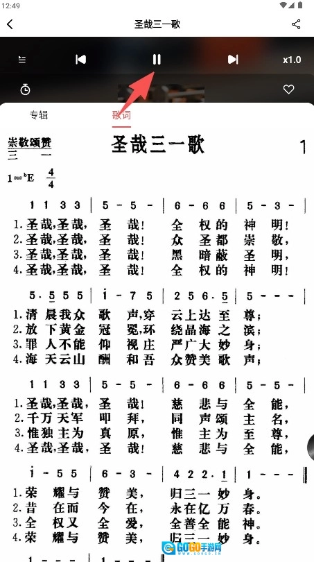 进入歌曲页面后,就能查看完整的歌词和乐谱,页面上方设有播放控制功能,方便大家跟着学唱或者静静聆听默想。
