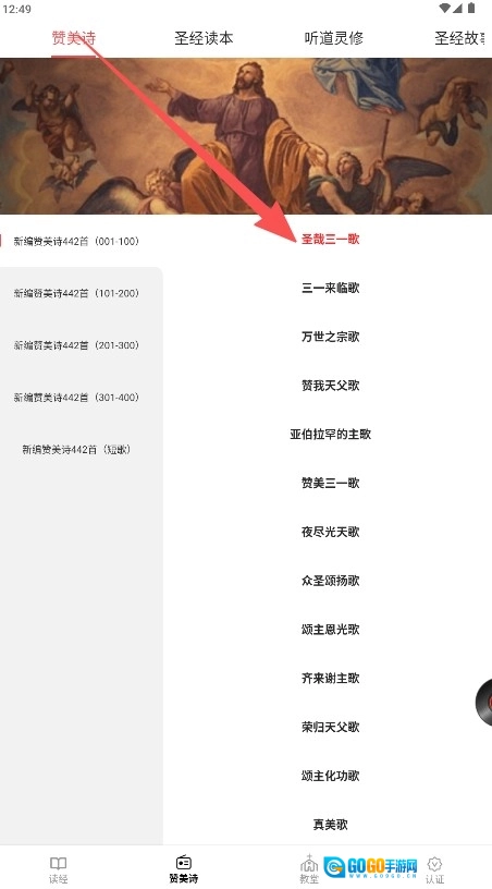 在赞美诗栏目中选择歌曲,例如“圣哉三一歌”。
