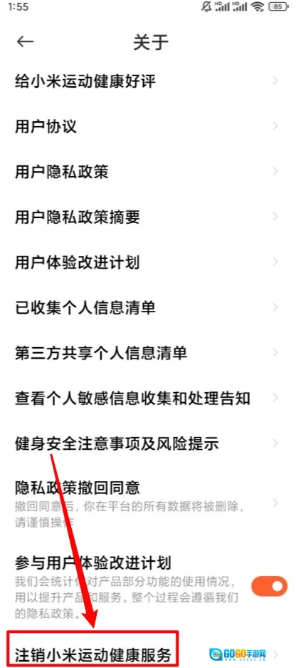 进入后滑动到最底部点击"注销小米运动健康服务"。