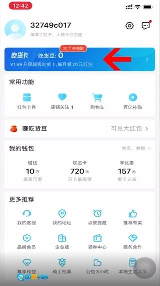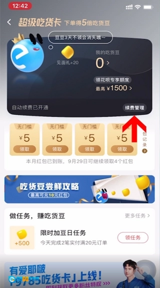 点击进入我的页面,然后在超级吃货卡板块里找到“续费管理”选项并点击进入。