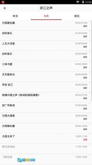这里的电台内容按昨天、今天、明天分类记录,还设有直播和回听等功能,能让用户每天都找到想听的内容。