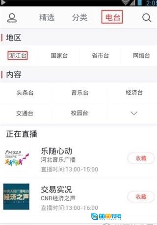 在“电台”界面,用户能够依据地区和内容来挑选想要收听的电台。