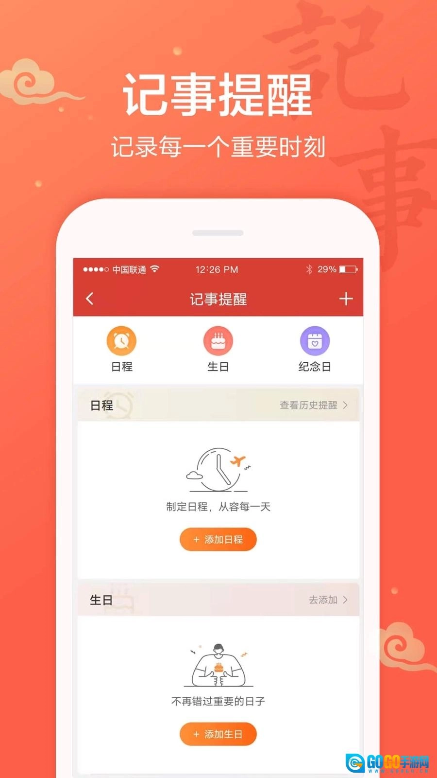 吉祥日历事件提醒,设置提醒闹钟到点准时提醒;